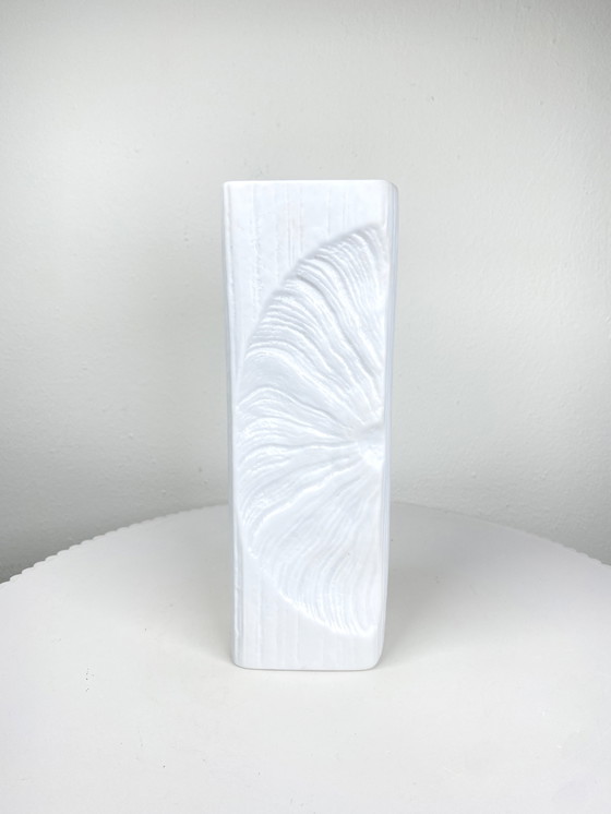 Een sculpturale, witte vintage Rosenthal Studio Line vaas ontworpen door de Duitser Martin Freyer in de jaren 1960. Mooie matte afwerking, gestructureerd schelp/bladontwerp en rechthoekige vorm.