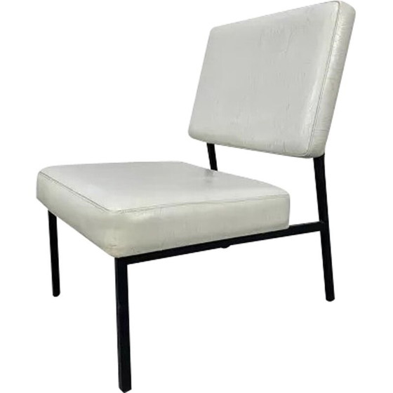 Modernistische stoel uit de jaren 50. Wit kunstleer, twee ongelukjes zichtbaar op de foto's, zwarte metalen structuur in goede staat. Afmetingen: hoogte 75 cm, breedte 51 cm, diepte 64 cm, zithoogte 37 cm, zitdiepte 46 cm.