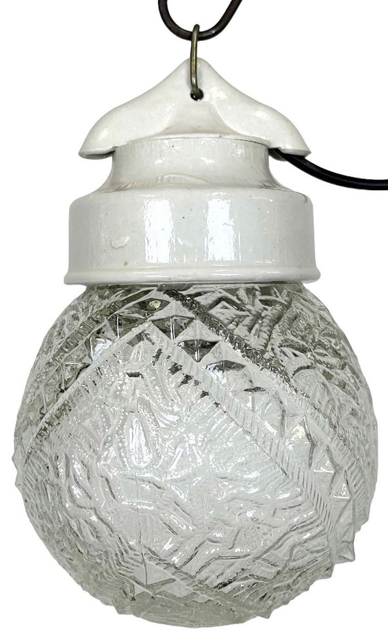 Vintage industriële lamp, gemaakt in Polen in de jaren 70. De lamp heeft een witte porseleinen bovenkant en een glazen kap. De fitting is geschikt voor E27/E26-lampen. Nieuwe kabel. De lamp weegt 1 kg.