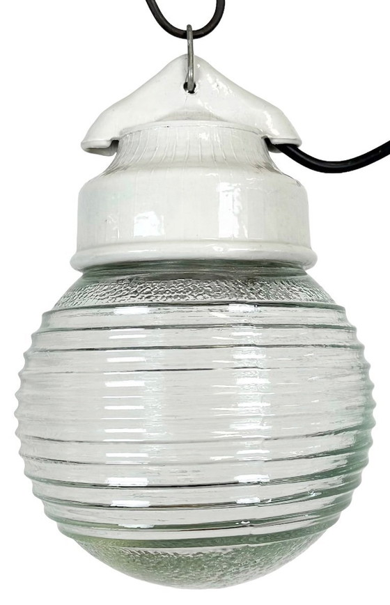 Vintage industriële lamp, gemaakt in Polen in de jaren 70. De lamp heeft een witte porseleinen bovenkant en een geribbelde glazen afdekking. De fitting is geschikt voor E27/E26-lampen. Nieuwe kabel. De lamp weegt 1 kg.