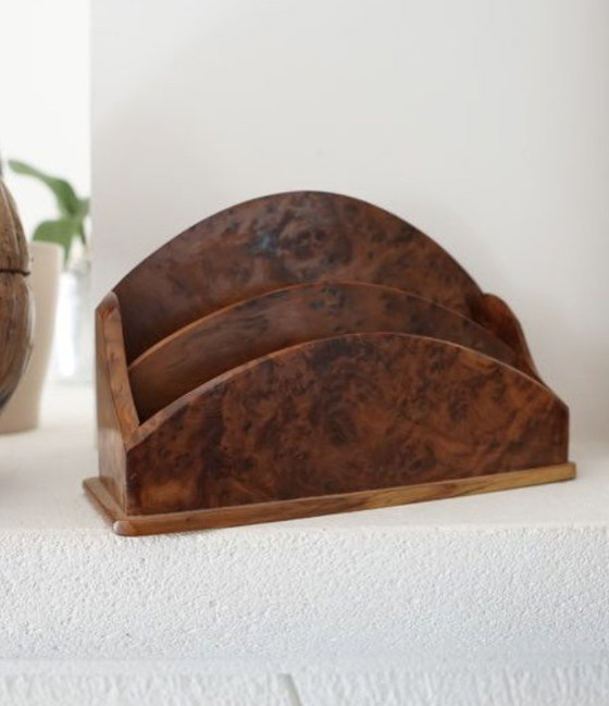 vintage briefhouder, elm burl, kostbaar hout, retro bureau, briefopslag, houten decoratief object, Mid Century, 70's design, vintage accessoire, elegant briefpapier, organische decoratie, natuurlijk hout, vintage vakmanschap