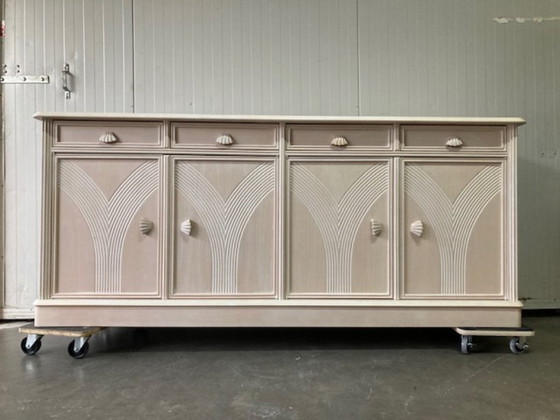 Prachtig vintage dressoir met 4 deuren en 4 laden. 1 plank in de kast. Het dressoir heeft mooie art deco elementen als schelpen. 1980s. 1 gaten in de achterwand voor kabels.