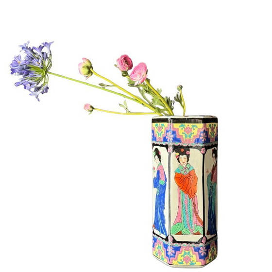 Opvallende en kleurrijke vintage vaas van geglazuurd keramiek, zeshoekig van vorm en rijk gedecoreerd met figuren in traditionele Aziatische kledij. De illustraties zijn deels gedrukt, deels met de hand ingekleurd in levendige tinten: roze, blauw, geel en groen op een ivoorwitte achtergrond.