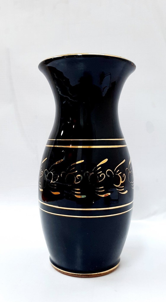 Deze prachtige vintage vaas, met een hoogte van 21 cm, getuigt van tijdloze elegantie en vakmanschap. Het strakke zwarte glazuur wordt prachtig aangevuld door complexe gouden details en geeft een verfijnde touch aan elk interieur.