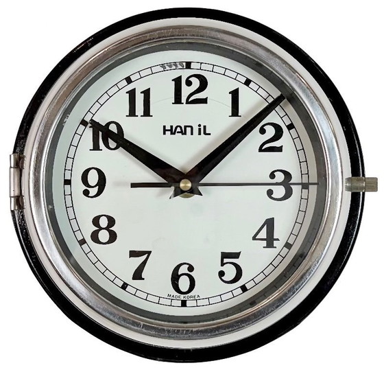 Vintage Hanil marine slavenklok, ontworpen in de jaren 70 en geproduceerd tot de jaren 90. Deze klokken werden gebruikt op grote Koreaanse tankers en vrachtschepen. De klok heeft een zwart metalen frame, een metalen wijzerplaat en een helder glazen deksel. Dit exemplaar is omgebouwd tot een batterijgevoed uurwerk en werkt op slechts 1 AA-batterij.