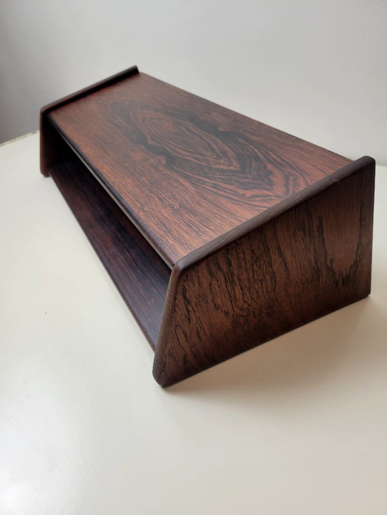 Bijzonder fraaie wandplank, model 24, van palissanderhout, ontworpen door Kai Kristiansen en geproduceerd door Aksel Kjersgaard, Denemarken, circa 1960. Een wandplank die ook als nachtkastje gebruikt kan worden, met als voordeel dat ze precies op de gewenste hoogte naast het bed geplaatst kan worden, terwijl de vloer vrij blijft. De wandplank kan ook mooi staan in combinatie met een spiegel in een hal. De wandplank verkeert in hele nette vintage staat.