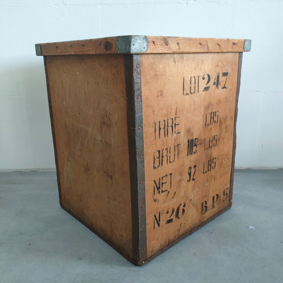 Deze vintage transport theekist is leuk ter decoratie of als showitem vermoedelijk jaren 50, mogelijk ouder. Afgewerkt (en ter bescherming tijdens transport) met metalen randen. \nIn vintage staat. Ook te gebruiken als thee/bijzet tafel met een bijvoorbeeld een glasplaat of mooie vintage houten plaat erop. Herkomst is niet duidelijk te herkennen. Op onderzijde van de kist staat een naam van een 'Export Estate'. Bij het ontcijferen hiervan lijkt de naam te duiden op "Sobacha" wat een Japanse kruidenthee is van boekweitkorrels. \n\nAfmetingen (ca) Hoogte 62 cm, Breedte 52 cm, Diepte 52 cm.\nVanwege de grootte is het per post lastig te versturen, echter neem gerust contact met ons op naar de mogelijkheden voor verzending/bezorging. Wij werken met diverse Europese en internationale transport-postbedrijven. Ophalen kan natuurlijk ook via een reguliere koerier zoals Brenger.