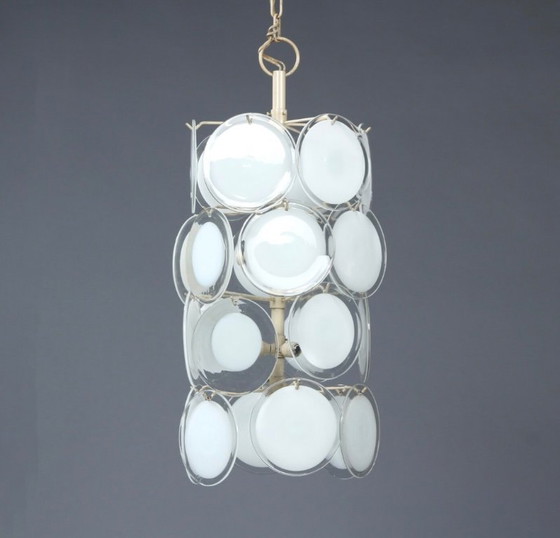 Deze Vistosi schotelkroonluchter is een prachtig voorbeeld van mid-century modern design. De kroonluchter bestaat uit een serie elegante glazen schalen in een cilindrische vorm en biedt een verfijnde esthetiek die in elke kamer past. De kroonluchter is gemaakt van hoogwaardig glas en metaal, waardoor hij zowel duurzaam als stijlvol is. Het unieke ontwerp is perfect om een vleugje elegantie toe te voegen aan je woonruimte.