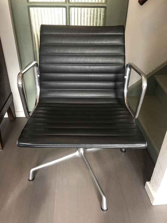 Vitra Eames draaistoel uit 2017. Het leer is in uitstekende staat. De gepolijste aluminium armleuning heeft een paar lichte krasjes die op de foto's te zien zijn. Vitra-labels op de basis en op de achterkant.