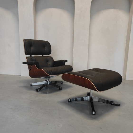 Te koop: Nieuwe Vitra Eames Lounge Chair met ottoman, uitgevoerd in palissanderhout en bekleed met Nero F premium leder. Deze designklassieker wordt geleverd met certificaten en biedt ultiem comfort en stijl. Een unieke kans om dit iconische meubelstuk aan uw interieur toe te voegen.