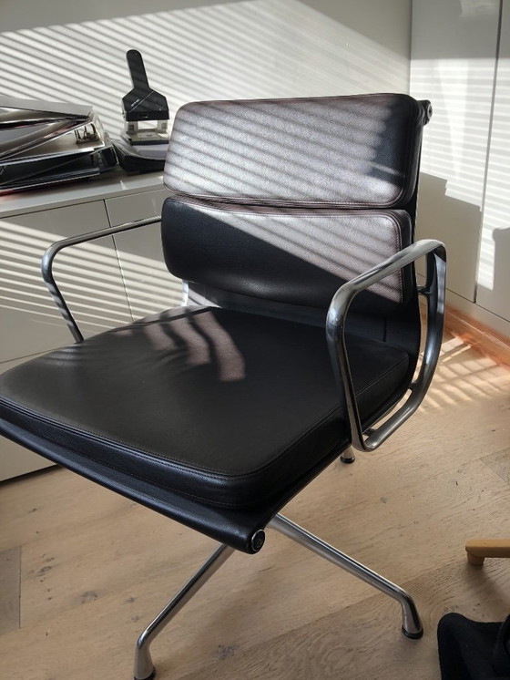Maak je werkplek compleet met deze stijlvolle original Vitra Eames Softpad draaibare stoel. Deze stoel is niet alleen een lust voor het oog, maar biedt ook ultiem comfort tijdens lange vergaderingen of werkuren. De bruine leren bekleding straalt luxe uit, terwijl het roestvrijstalen frame zorgt voor een moderne touch in je kantoor of thuiswerkplek.