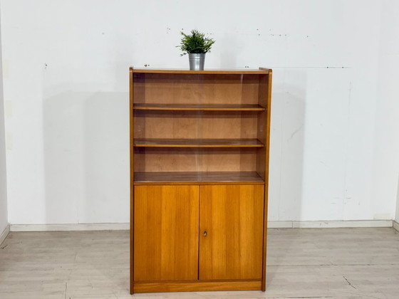 Dit meubelstuk combineert esthetiek met functionaliteit: het bovenste gedeelte heeft drie open planken met glazen deuren, ideaal voor boeken of decoratieve objecten. Het onderste gedeelte is een gesloten kast met twee afsluitbare deuren (sleutel inbegrepen), die voldoende verborgen opbergruimte biedt. De kast is in zeer goede, goed onderhouden vintage staat. Een stijlvol en praktisch meubelstuk voor elke woonruimte.