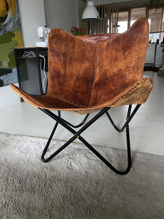 Omarm het unieke karakter en de geschiedenis van deze Vlinderstoel leren fauteuil en laat hem een blikvanger in uw huis worden.