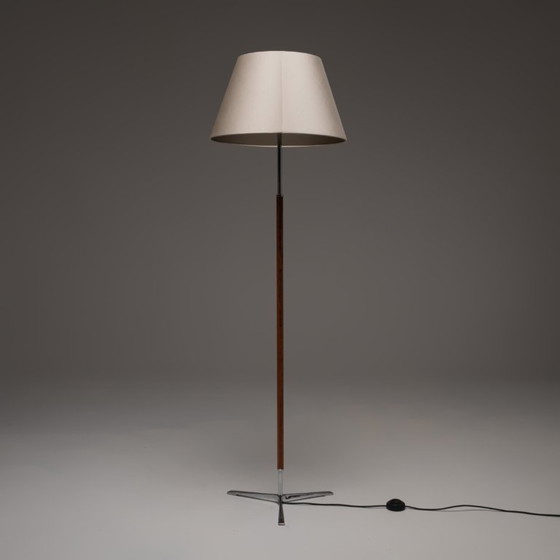 Deze elegante vloerlamp uit de jaren 60, gemaakt van chroom en teakhout met een kap, is een prachtig voorbeeld van Europees design uit het midden van de vorige eeuw. De lamp combineert een slanke chromen steel met een schacht van teakhoutfineer en een metalen driepootvoet, en belichaamt precisie, proportie en ingetogen verfijning.