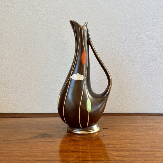 Mooi elegant Bay W.Geremany vaasje. Dit model is gefabriceerd in de 50er jaren. De sticker die Bay Keramik gebruikte in de jaren 50 en 60 is nog aanwezig. Model 282/20 Hoogte 20cm Breedte 10cm Basiskleur is bruin. De vloeiende verticale lijnen zijn in de glazuur "gekrast" zodat daar geen glazuur meegebakken is. De kleuraccenten zijn rood, geel, en groen. Langs de randen zijn goudaccenten aangebracht. Het vaasje is in heel goede staat.
