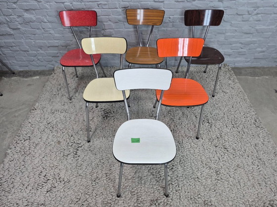 Een bijzonder charmante en visueel speelse set van zes vintage keukenstoelen van Brabantia, geproduceerd in Nederland in de jaren 60. Deze set valt op door de bewust gevarieerde samenstelling, met een harmonieuze mix van kleuren en afwerkingen: wit, crème, oranje, rood, houtnerf en een donkerdere palissander-achtige houtnerf.