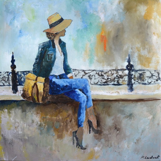 This captivating artwork depicts an elegant woman seated on a low wall, lost in a gentle reverie. She wears a wide-brimmed straw hat and a dark green jacket that contrast beautifully with her bright blue jeans. The artist uses rich, textured tones to create a serene and contemplative atmosphere. The blurred background, blended with pastel hues, accentuates the tranquility of the moment. Beside her, a bright yellow bag adds a touch of modernity and dynamism to the scene. The subtle play of light on her high heels lends a sophisticated dimension. The composition harmoniously balances the elements, reflecting a fusion of nostalgia and modernity. The meticulous details, combined with a carefully chosen color palette, make this painting a true celebration of contemporary elegance and femininity.