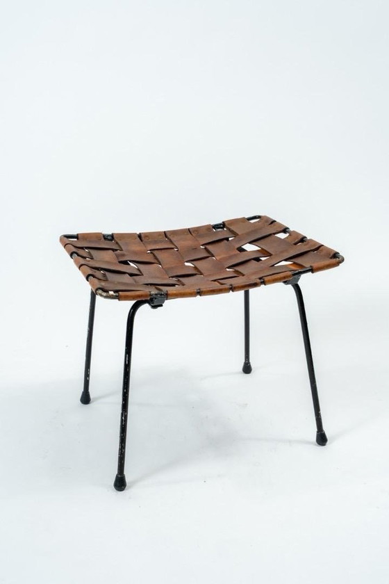 Het meubelstuk belichaamt het organische modernisme van die tijd: de luchtige lichtheid van het minimalistische stalen frame contrasteert met de licht concave zitting, gemaakt van brede, geweven leren banden van rundleer. De met de hand gestikte leren banden voelen warm aan en de patina geeft de kruk een uniek, tijdloos karakter.