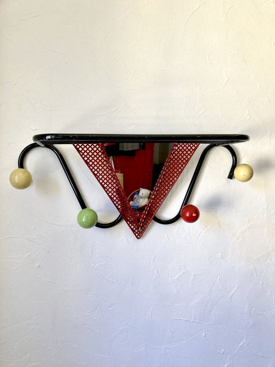 In goede vintage staat, met een patina die past bij de leeftijd: lichte slijtage aan de verf op de bolhaken, een licht doffe bovenste plank en verspreide gebruikssporen.