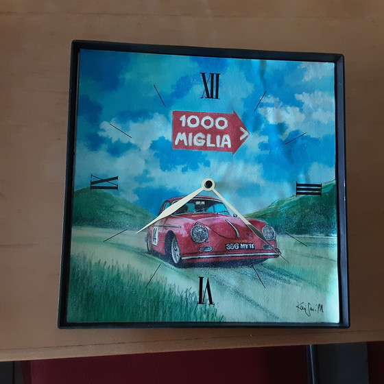 Wandklok 1000 Miglia originele tekening van Kai Gaedicke. Kai Gaedicke studeerde aan de Hochschule für Gestaltung en tekende jarenlang de AvD-kalender. Zijn passie was oude voertuigen. Hij plakte zijn tekening op de plastic basis, daarom is de tekening licht golvend.