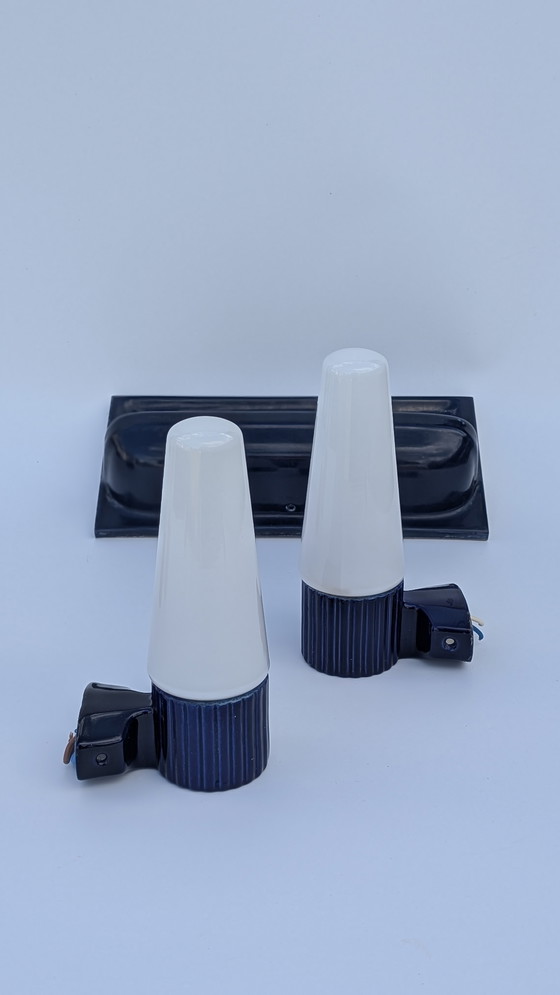 Ontdek deze elegante set van twee IFÖ 6020 wandlampen en een keramisch zeepbakje, perfect om een vintage tintje aan je badkamer te geven. De wandlampen met hun strakke design en witte en blauwe keramische afwerking passen harmonieus in elke ruimte, of die nu modern of klassiek is. Het bijpassende zeepbakje maakt de look in stijl af.