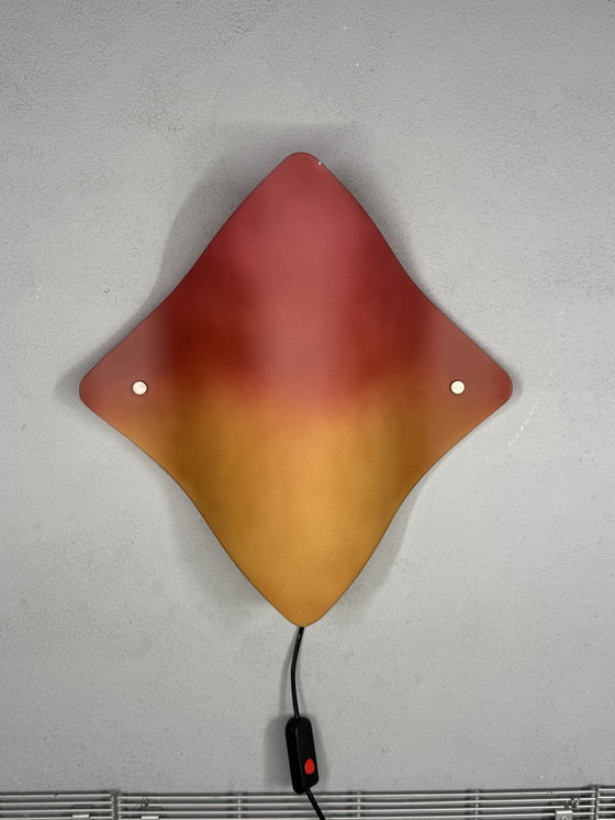 Bijzondere wandlamp met een opvallende kap in een warm kleurverloop van rood naar ambergeel. Het matte oppervlak zorgt voor een zacht, sfeervol licht dat mooi over de muur wordt verspreid. Door de organische, ruitvormige vorm is deze lamp een echte blikvanger, zowel aan als uit.