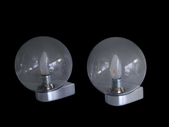 Set van twee wandlampen uit de jaren 70 met rookglazen bollen.