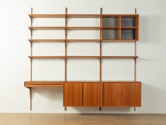 Klassiek stellingsysteem uit de jaren 60. De hoogwaardige bakken en planken zijn gefineerd met teakhout. Het systeem bestaat uit negen planken: één bak met schuifdeuren en planken, één bak met deuren en plank, een open bak met planken, één bureau-element met twee lades en vier houten ladders.