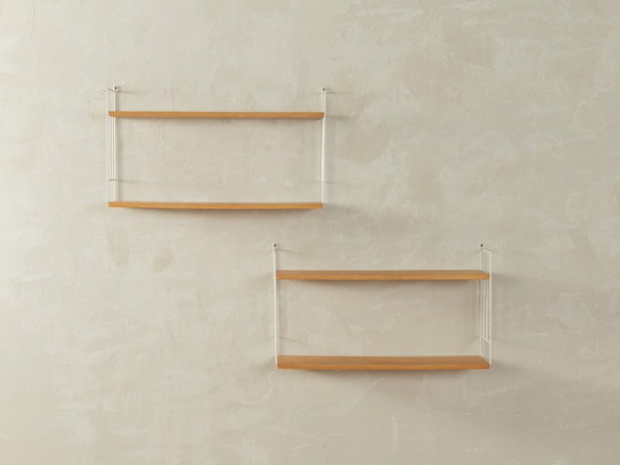 Klassieke wandplanken uit de jaren 1960 bestaande uit vier witte metalen ladders en vier essenhouten gefineerde planken. Eenvoudige wandmontage met drie schroeven. De aanbieding omvat twee wandplanken. Goede gerestaureerde staat met lichte gebruikssporen. Gemaakt in Duitsland, fabrikant: WHB.