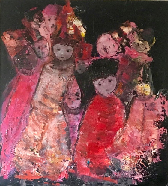 What is happening is geschilderd op linnen. Het formaat is 110 x 100 x 2 cm.