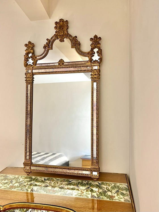 Prachtige vintage kasteelspiegel met luxe ornamenten en gerookt glas aan de zijkanten van de Belgische spiegelmaker DeKnudt. Deze spiegel bevind zich ik een zeer goede staat en is prachtig bewaard gebleven.