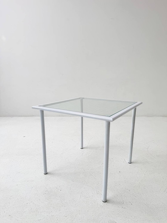 Conditie: De tafel is in algehele goede staat. Het glazen blad is schoon en helder, zonder zichtbare krassen of beschadigingen, wat de zorgvuldige behandeling benadrukt. Het rasterpatroon op het glas is goed bewaard gebleven en bijna overal gelijk. Het witte metalen frame en de poten zijn stabiel en vertonen geen duidelijke gebruikssporen zoals krassen, deuken of verkleuring. Over het geheel genomen is de tafel in zeer goede staat en klaar voor onmiddellijk gebruik.