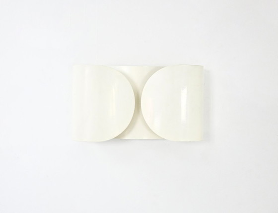 Wandlamp van wit metaal, ontworpen door Afra & Tobia Scarpa. Model: Foglio. Gestempeld met Flos. Vertoont gebruikssporen door ouderdom en de tand des tijds.