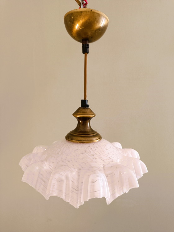 Hanglamp van wit en gespikkeld Clichy glas. Rond met gekartelde randen, voorzien van een E27 schroeflamphouder en een verstelbaar snoer. De kap van de lamphouder en de kap boven het glas zijn van messing. Deze ophanging is functioneel, zie foto, de opaline is in zeer goede staat, er zijn slechts een paar vlekjes op de kabelafdekking. Met zijn jaren 60 look zal deze hanglamp van hoge kwaliteit mooi staan in elk interieur. Hoogte 15 cm Breedte 28 cm Totale hoogte 35 cm Gewicht ,860 Kg