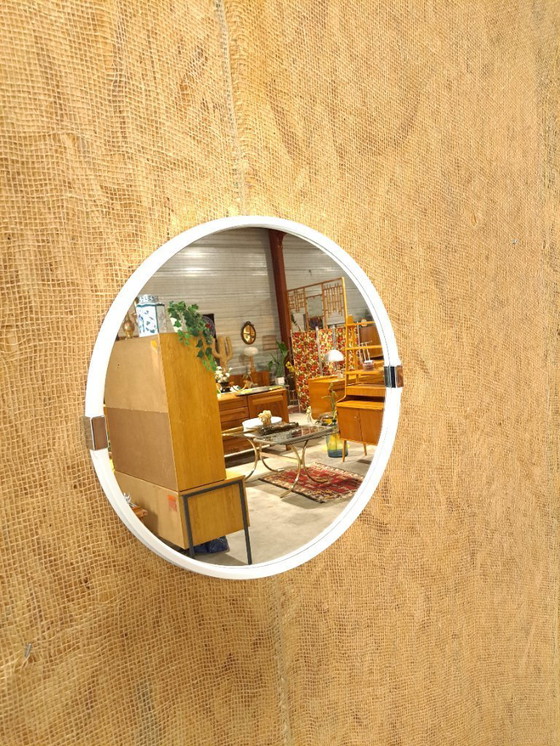 Space age vintage spiegel. De ronde spiegel komt uit Oost Duitsland en is gemaakt van wit kunststof met daarbij chromen details.
