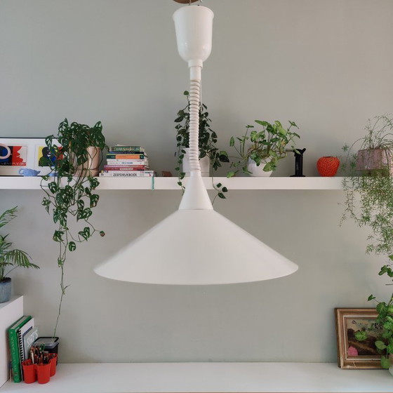Vintage IKEA Heksenhoed trekpendel lamp (model T710), wit. Een echt jaren '70 icoon in een prachtige staat voor een lamp van 50 jaar oud!