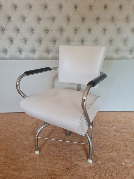 Deze originele salonstoel uit 1960 is geïmporteerd uit de Verenigde Staten en komt waarschijnlijk uit een kapsalon of schoonheidssalon. Met een klassiek Mid Century ontwerp met een chromen buisframe, gewatteerde witte kunstlederen bekleding en armleuningen met zwarte details, belichaamt hij zowel comfort als stijl. Een echt vintage stuk, ideaal voor interieurs die op zoek zijn naar een retro of industrieel tintje.
