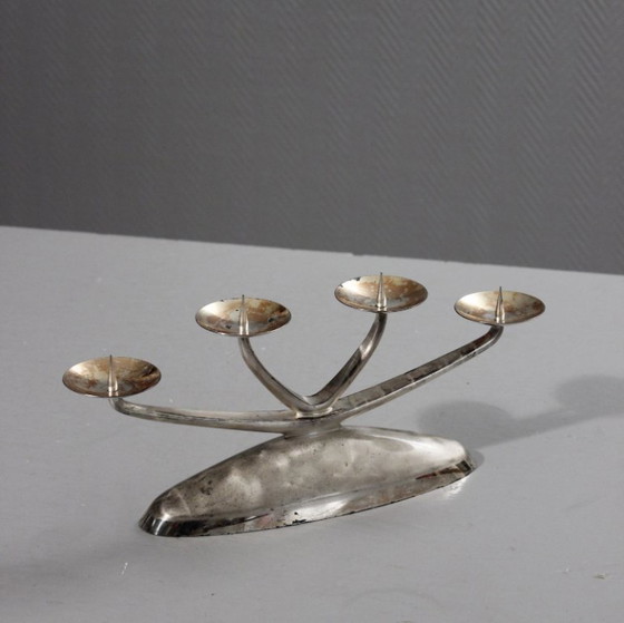 Prachtige vierarmige, verzilverde metalen kandelaar, gemaakt door WMF Ikora, Duitsland, circa 1950.