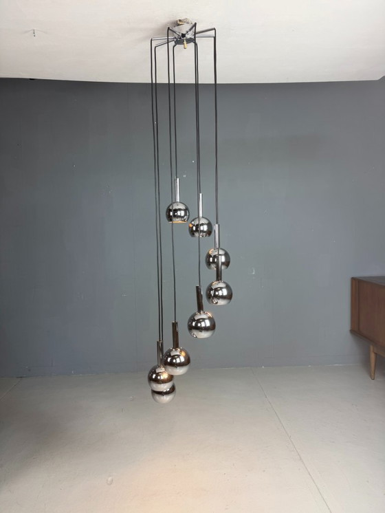 Prachtige plafondlamp uit het Space Age-tijdperk, met acht metalen kappen in een strak, futuristisch design. Dit iconische stuk legt de essentie van het Space Age-tijdperk vast, met zijn strakke geometrische vormen en chroommetallic afwerking, die de opwinding van ruimtevaart en moderne innovatie uit die tijd oproepen. De kappen hangen op verschillende hoogtes, wat een opvallend cascade-effect creëert dat de visuele aantrekkingskracht van de lamp versterkt. Perfect om een gedurfde, retro-futuristische touch aan elk interieur toe te voegen, is deze lamp een echt statement piece en een prachtig voorbeeld van mid-century modern lichtdesign. Zeldzaam en zeer verzamelbaar, belichaamt hij de vooruitstrevende geest van de jaren 70.