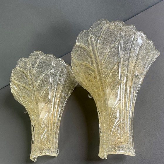 Prachtig klassiek paar eenlichtslampen uit 1990 in de stijl van Barovier en Toso. Dik Murano glas met goudkleurige graniglia en vergulde metalen frames.