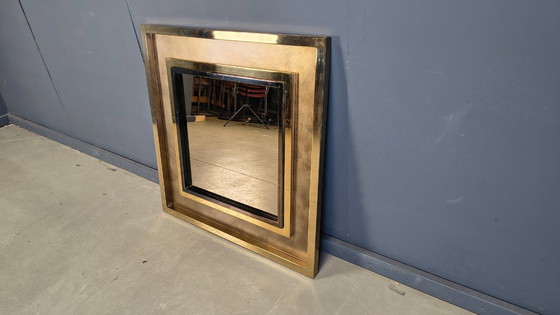 Indrukwekkende grote wandspiegel van Maison Jansen, gemaakt van geborsteld staal en messing.