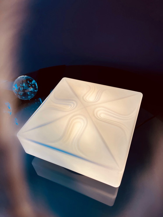Deze Tsjechoslowakije jaren '70 plafonierre krijg je gewoon niet meer uit je hoofd. Een item met een geweldig bloem figuur gecombineerd met de wit mat glazen kap. Een parel voor aan het plafond.