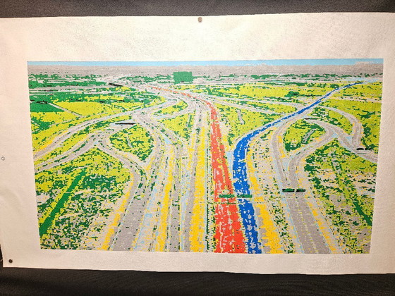 Ervaar de levendige expressie van deze zeefdruk op canvas, een meesterwerk van Henk van der Vet. Dit kunstwerk vangt de dynamiek van een stedelijk landschap in een abstracte stijl, waarbij felle kleuren zoals groen, geel, rood en blauw harmonieus samenkomen.
