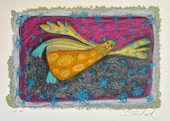 De zeefdruk is gedrukt op dun Japans papier en daarna voor de stevigheid verlijmd op zuurvrij karton.