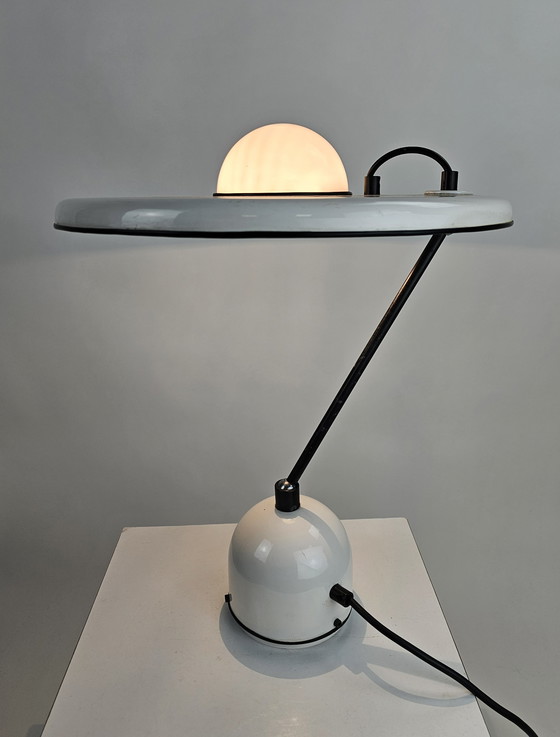 Deze zeer bijzondere space age tafellamp uit de jaren 80 combineert metaal en kunststof in een futuristisch ontwerp. De lamp heeft een opvallende bolvormige kap en een strakke, moderne uitstraling. Perfect voor liefhebbers van retro en space age design, deze lamp voegt een unieke touch toe aan elke ruimte.