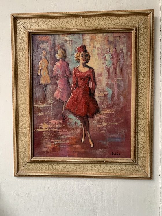 Stap binnen in de bruisende wereld van Parijs in de jaren 60 met dit fascinerende olieverfschilderij, dat de essentie van de artistieke flair van Montmartre belichaamt. De scène bruist van beweging en kleur en vangt de elegantie en stijl van die tijd. Klein scheurtje van 8 mm bovenaan.