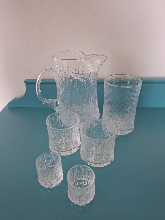 Deze set bestaat uit de Iittala Ultima Thule glazen en karaf, ontworpen door Tapio Wirkkala.