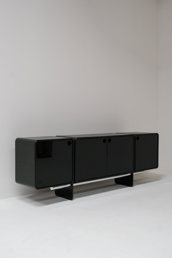 Deze unieke brutalistische kast, waarschijnlijk uit de jaren 1960 en ontworpen door een Belgische ontwerper, is een echt pronkstuk. Hoewel de ontwerper onbekend is, is het vakmanschap onmiskenbaar uitstekend. De kast heeft een strakke zwarte pianolak afwerking in uitstekende staat. Met een lengte van 246 cm en een hoogte van 85 cm biedt het zowel aanwezigheid als functionaliteit. De elegante afgeronde hoeken van de kast en de deuren voegen een vleugje verfijning toe aan het robuuste ontwerp. Een zeldzame vondst - de kans dat je nog zo'n exemplaar tegenkomt is klein. Let op, de items zichtbaar op de laatste foto zijn voor decoratieve doeleinden en zijn niet inbegrepen in de prijs.