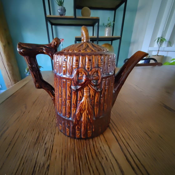 Zeldzame Belfield & Co. theepot met Rockingham glazuur en prachtig reliëf van bamboestengels, bladeren en een strik. Schots ontwerp, 20 cm hoog. In goede conditie, zonder schade of reparaties. Een uniek stuk voor de gevorderde verzamelaar of liefhebber van curiosa.