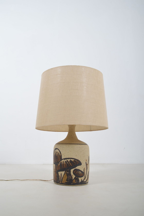 Zeldzame Deense keramische lamp ontworpen door Bente Jessen in de jaren '70. De lamp is mooi door zijn grootte (hoogte bijna 70 cm) en het prachtige decor van paddestoelen.